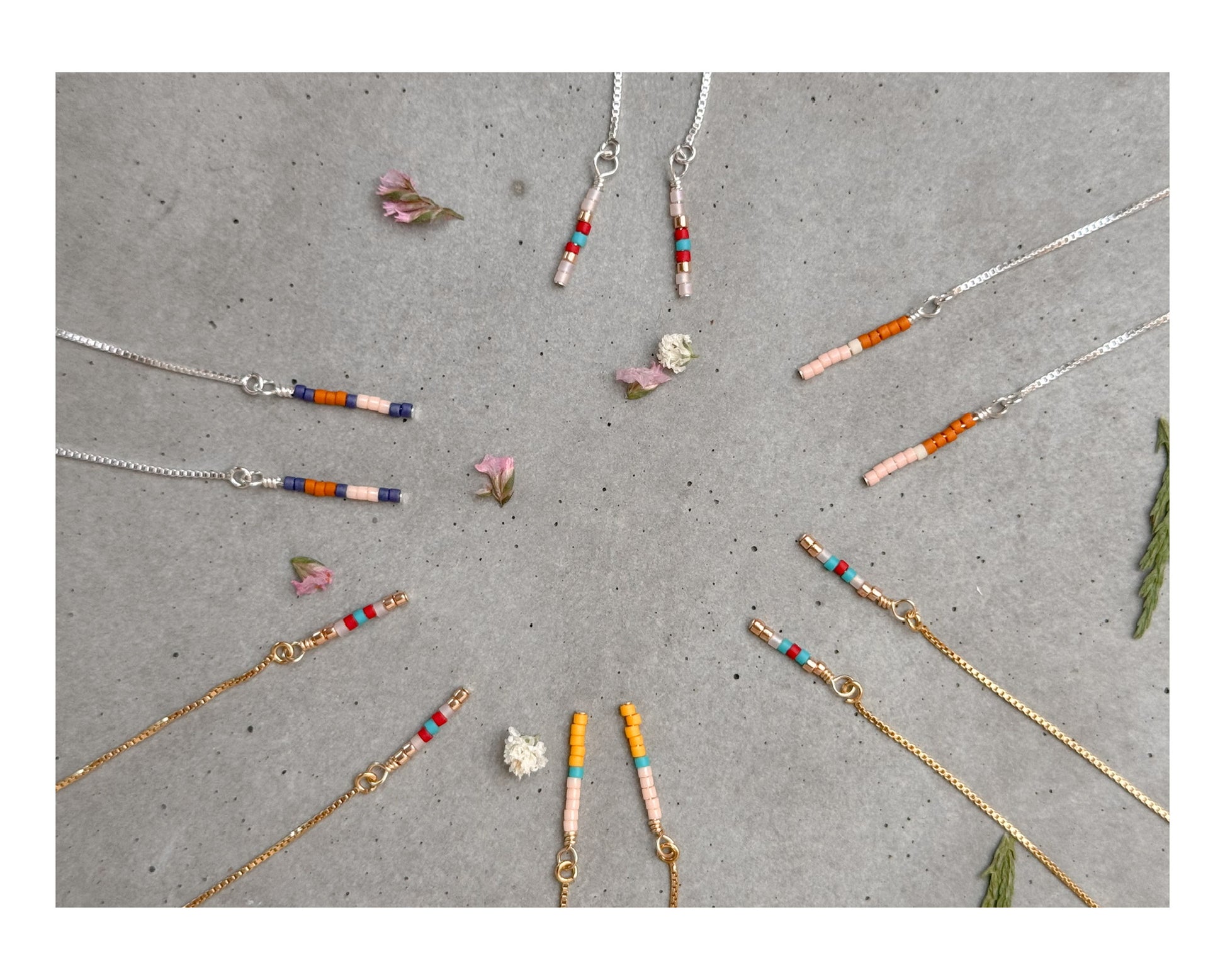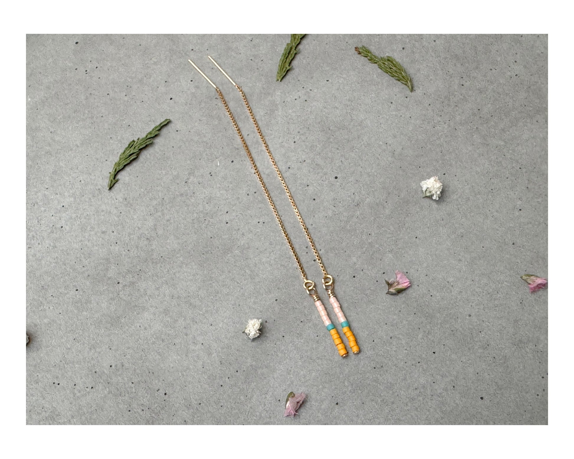 These playful beaded threaders, available in .925 sterling silver or 14k gold filled, bring versatile charm to your ears. With colorful bead patterns and a maximum length of 3.5 inches, you can easily adjust their length or weave them through multiple piercings for a fresh, fun look every time.